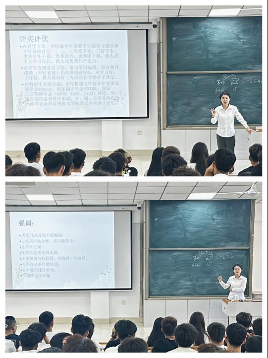 陈鑫对新入学的新生表示欢迎,详细的为新生普及了校规校纪,通过生动的案例逐一的将老员工手册上的内容进行讲解,通过电信诈骗实例提醒员工不要上当受骗,播放了多种诈骗实例视频,提醒员工时刻保持警惕。同时对同学们提出了具体要求,要求同学们树立明确的学习目标,制定合理的学习计划,刻苦学习,不断进步。希望同学们珍惜大学时光,积极参与各种活动,提高自己的综合素质。